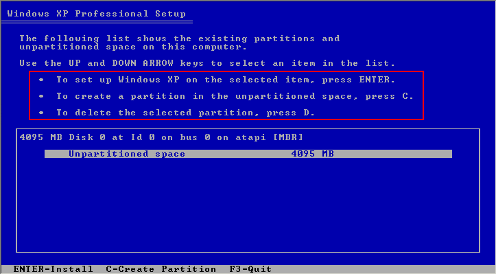 Ben önce C tuşu ile bölümledim ve Enter tuşu ile devam ettim.